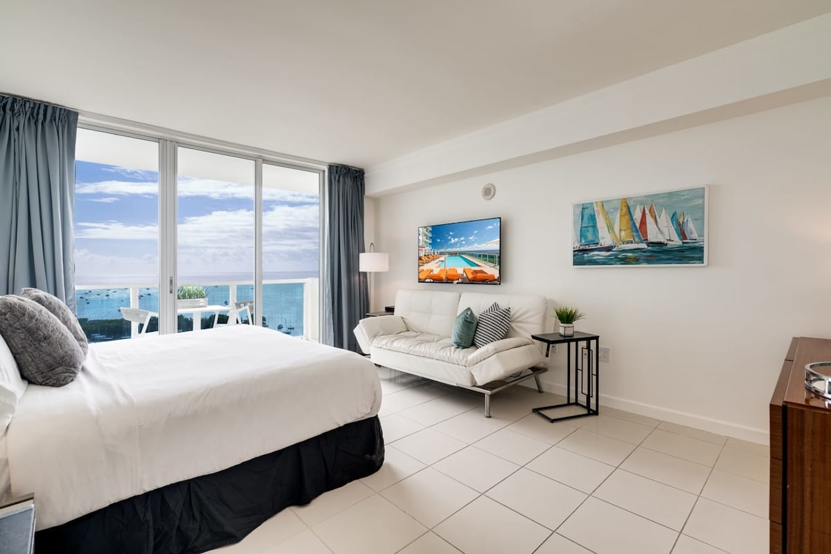 Penthouse Level Studio cu VEDERE DIRECTĂ LA APĂ în Miami Design District, o cameră cu priveliște, decorată cu multă dragoste și inspirată de ocean. Residence are ferestre de la podea la tavan de 12'' și acces la facilitățile în stil stațiune, piscină uimitoare cu cabane, sală de gimnastică (deschisă 24 de ore), lounge modern, zonă de grătar, stație de încărcare a mașinilor electrice și PARCARE GRATUITĂ ALOCATĂ în inima orașului Miami. Maximum 3 oaspeți. Distanță de mers pe jos până la cele mai bune magazine, restaurante, muzee și multe altele.
