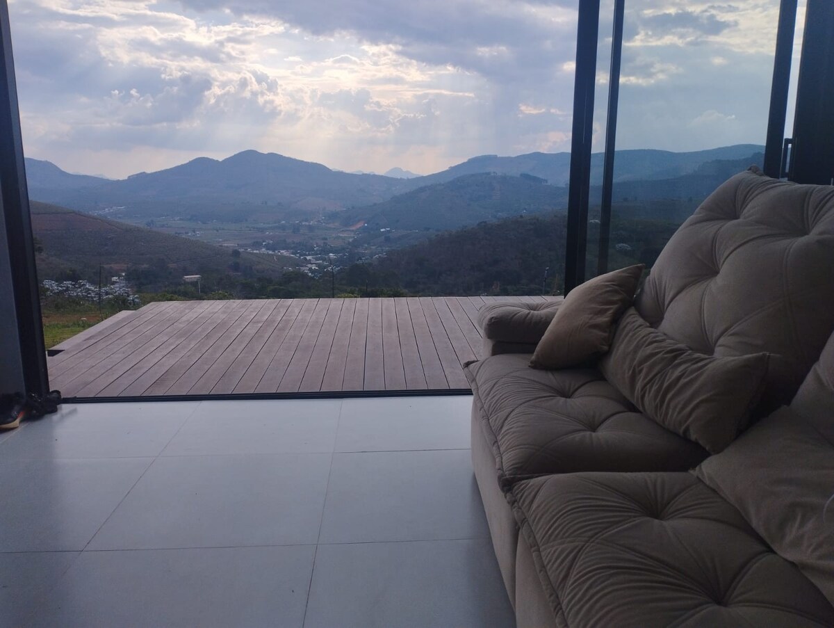 CABANĂ IP VIOLET - Apartamentul 1 sau 2 *Suită cu pat matrimonial, minibar, Smart TV LED 43”, aer condiționat cald/rece, Wi-Fi, balcon privat cu vedere la Pedra Menina și Parcul Național Caparaó și șemineu ecologic. De împărțit: sală de sticlă cu terasă decorată cu 2 fotolii frumoase din frânghie nautică, masă rotundă cu 4 scaune confortabile din piele, cafetieră electrică, râșniță de cafea, aparat de făcut sandvișuri și cuptor cu microunde. 600 R$/noapte *Check-in între 14:00 și 21:00 Check-out până la 12:00