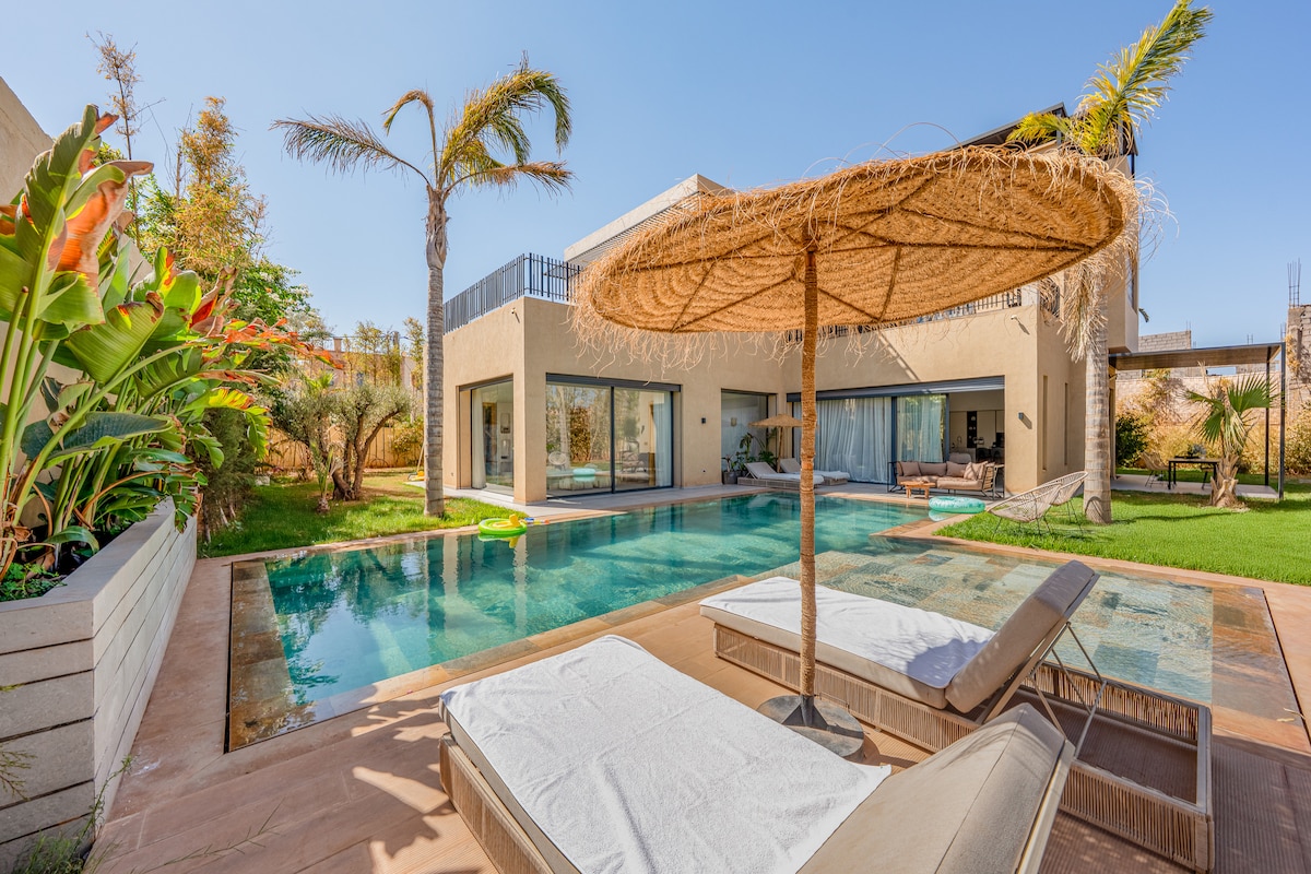 Relax in this magnificent luxury villa, combining modernity and tradition with a private heated swimming pool. Enjoy a location close to all amenities, 20 min from Jemaa Fna square, 10 min from Al Mazar shopping center (Carrefour hypermarket). This luxurious 550m2 villa boasts panoramic views of the Atlas Mountains. In a secure residence with janitor. The villa is brand-new, equipped with top-of-the-range furnishings and appliances.