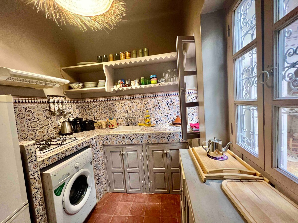 Dar Nurah ist ein stilvolles Riad für bis zu 6 Gäste, besonders komfortabel für Familien, Freunde oder Paare mit bis zu 4 Personen. Das Haus wird immer komplett vermietet, sodass ihr das Riad ganz für euch allein habt und keine anderen Gäste anwesend sind. Die Wohnfläche beträgt insgesamt ca. 180qm. Es gibt 2 wunderschön eingerichtete Schlafzimmer mit eigenem Bad, ein Wohnzimmer mit Schlafsofa und viele offene Wohnbereiche. Auf der Dachterasse findet ihr einen Essbereich für 4 - 6 Personen.