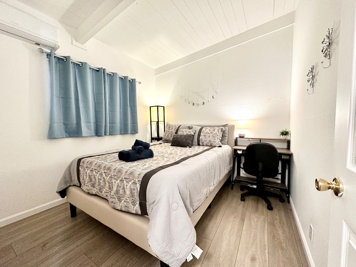 Studioul nostru confortabil, dar MIC, este perfect pentru călătorii singuri (prea înghesuit pentru 2). Design modern, piatră/gresie europeană de lux în bucătărie și baie. Curte privată, parcare cu poartă securizată, spălătorie, șemineu electric, duș cu efect de ploaie, oglindă de machiaj cu LED, Keurig, birou, Wi-Fi puternic, bucătărie complet aprovizionată cu ustensile și vase de gătit. Aproape de aeroportul SJC, campusul SJSU, SAP Center, Convention Center, Downtown SJ, HWY-87, companii de tehnologie precum Zoom, Adobe, PWC, EY. Mergi pe jos până în Japantown.
