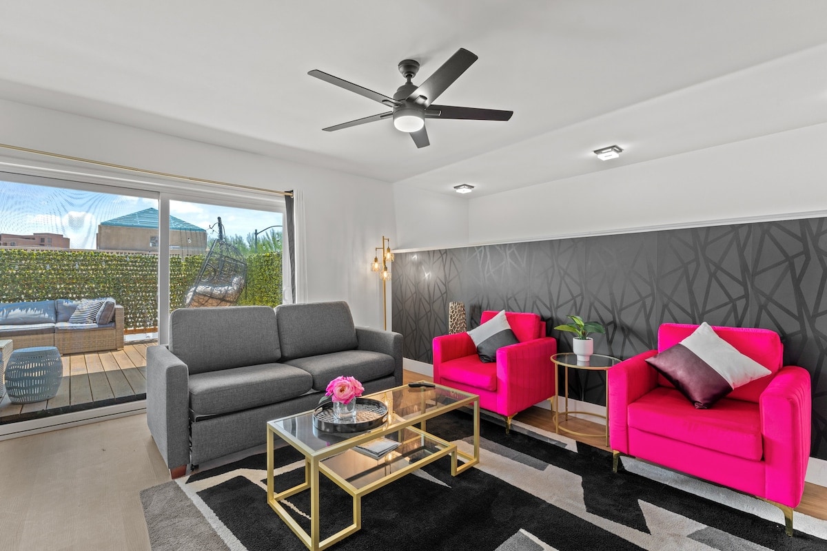 Această escapadă unică din Scottsdale îmbină stilul retro cu confortul modern. Aspectul pe mai multe niveluri include mobilier personalizat, accente colorate și opere de artă atrăgătoare, inclusiv o pictură murală mare inspirată de Valley Ho în 1969. Reviste de epocă și un player de discuri adaugă detalii nostalgice peste tot. La parter, un studio separat are o temă Scottsdale, completată cu o chicinetă și o baie completă, oferind spațiu suplimentar și flexibilitate pentru șederea ta.