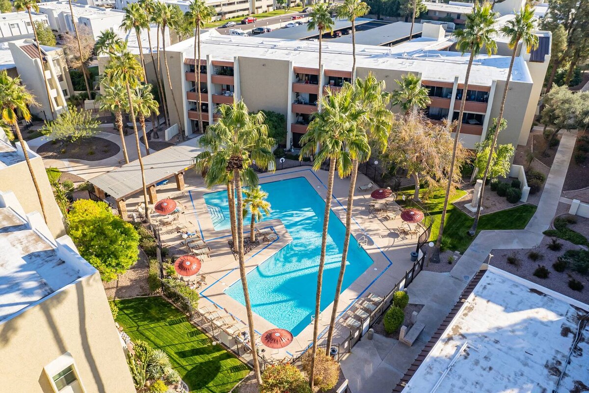 Acest apartament cu un dormitor și o baie la etajul al doilea (o jumătate de zbor de scări) se află la mai puțin de O MILĂ de toate: Fashion Square, Old Town Scottsdale și multe altele! Poți face o plimbare relaxată și ajunge în centrul vechi în mai puțin de 20 de minute. De asemenea, este la mai puțin de 12 minute de Tempe Marketplace. Complexul Maya Condo are, de asemenea, o piscină mare, o cadă cu hidromasaj și o sală de gimnastică mică (mai veche). Terasa este amenajată într-un videoclip boem relaxant - locul perfect pentru a te relaxa după o zi lungă de explorare!