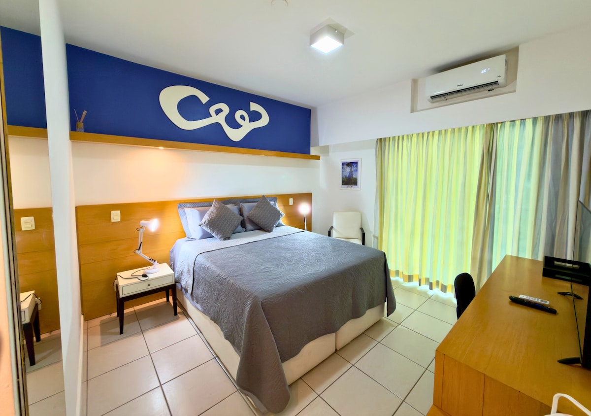 Amplo sala e quarto varanda, decorado, totalmente equipado Internet fibra optica alta velocidade, Wi-Fi, 2 smart tv's. na sala 55" no quarto 46", sala com ventilador de teto sofá cama, quarto cama de casal, ar condicionado split, agradavel escritorio impressora, cozinha americana geladeira,fogão, micro ondas, torradeira, liquidificador, máquina Nespresso, utensílios,secador de cabelos,máquina de lavar roupas,ferro e tabua de passar roupas,charmosa varanda com vista lateral da praia e piscina.