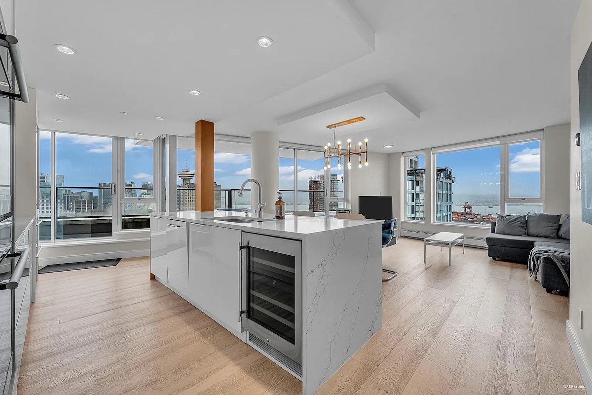 Bine ai venit în centrul orașului Vancouver, o cutie de sticlă superbă pe cer. Cu priveliști panoramice asupra munților, apei și orașului din fiecare cameră, vei experimenta exact de ce ne place atât de mult apartamentul nostru și Vancouver. O locație superbă cu dotări excelente, descoperă-ne! Locuința noastră este un apartament cu 2 dormitoare + den/al treilea dormitor, 2 băi, cu 950 mp de spațiu eclectic de designer! În calitate de Super-gazdă Airbnb de mult timp, te rog să consulți profilul meu pentru peste 600 de recenzii fabuloase despre mine, despre anunțurile din trecut și prezent și despre locație.