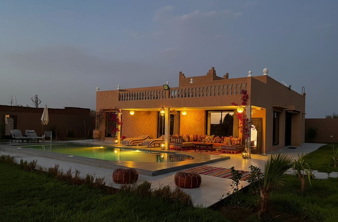Explorează splendoarea vilei noastre unice, un amestec amețitor de modernitate și tradiții marocane. Piscina noastră încălzită și Hammam Beldi te invită la momente de fericire pură. Rezervă-ți visul marocan astăzi