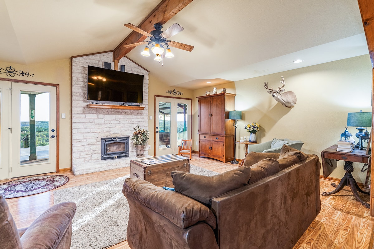 Welcome to The Overlook Tower! This 2-bedroom, 1-bathroom home is perfect for couples, small families, and lake lovers seeking a tranquil getaway. Amenities include a 5-person hot tub, large patio with lounge chairs/chaises, panoramic views of the Texas Hill Country, RV hookup/Tesla charger, 2 Smart TVs, 2 couches, a dining table, and a fully stocked kitchen. Each room is equipped to enjoy your trip with comfort! Enjoy your stay!