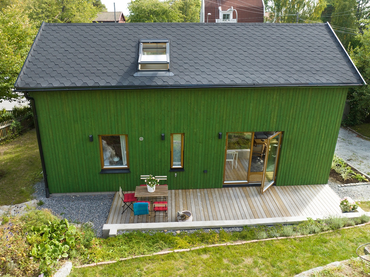 Bine ați venit la noua noastră casă ecologică (2023), cu un caracter calm și curat, cu o înălțime a tavanului de 5 metri. Casa se caracterizează printr-un spațiu de aer în combinație cu o colecție de fotografii de dimensiuni mari pe pereți. Zonă de luat masa pentru întreaga familie pe terasa din lemn de afară. Parcare gratuită cu încărcător pentru o mașină. Cartier liniștit la aproximativ 5 km de orașul Stockholm, la 10 minute de mers pe jos de stația de metrou și la 11 minute de mers cu mașina de oraș. Se află la aproximativ 1 km de zonele naturale și plajele lacului Mälaren