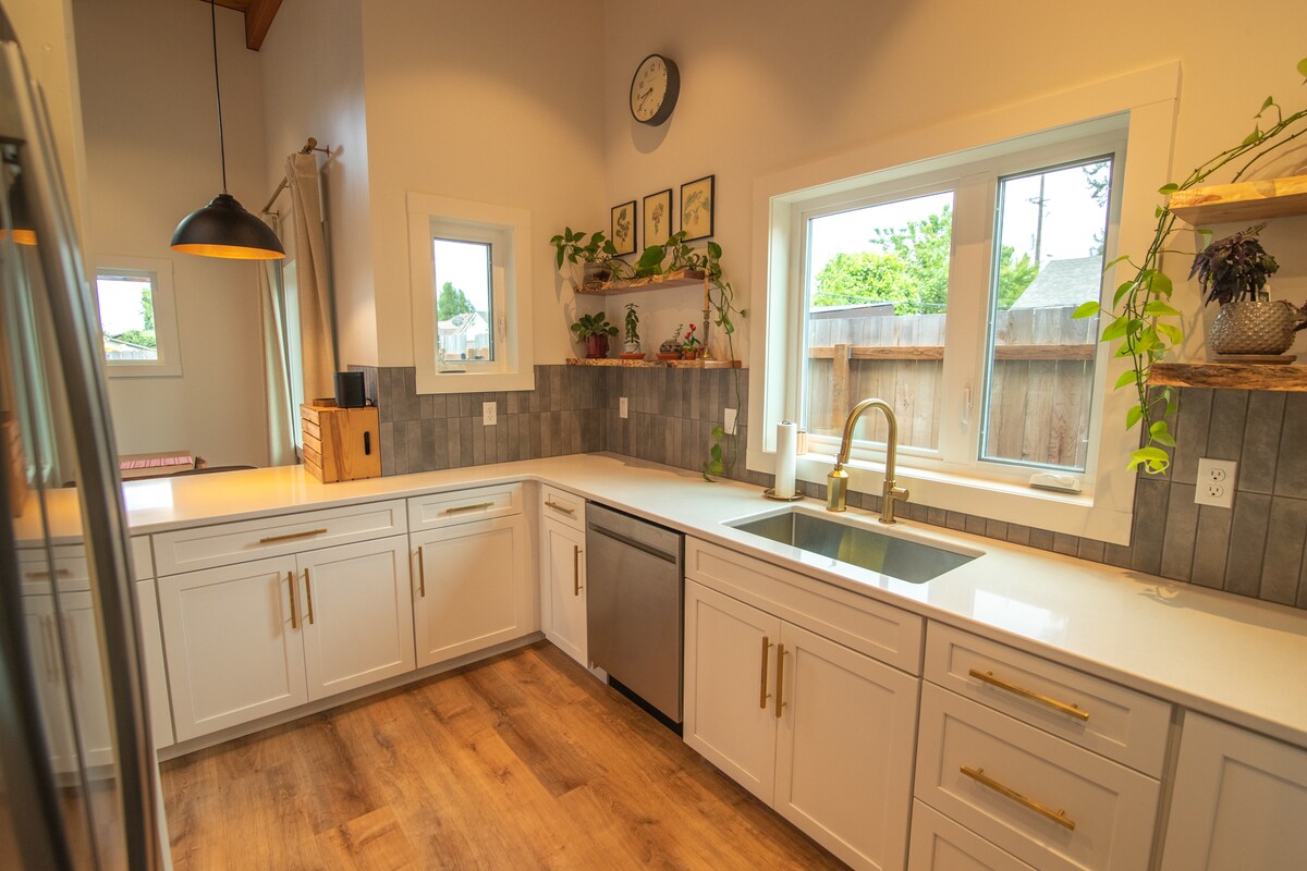 Brand new construction in the heart of Corvallis! You will love this private bungalow surrounded by blueberry bushes and a unique outdoor living space. Inside, you'll find a large open concept living room and kitchen with custom cabinetry, quartz countertops, stainless steel appliances, and a beautiful glass tile backsplash. The living room has a sofa bed that sleeps two while the private bedroom has a queen size bed. Gorgeous tile in the bathroom, and a washer/dryer for your use.