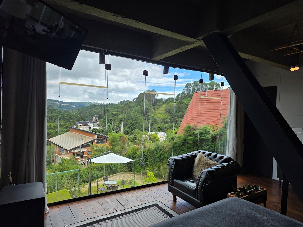 Descubra o equilíbrio perfeito entre tranquilidade e conveniência! Hospede-se em um Studio aconchegante de 27m², com design industrial rústico, detalhes únicos como painel grafitado com iluminação indireta e piso histórico do Parque Capivari e uma vista cinematográfica de 180° para o Parque Bosque do Silêncio, Morro do Elefante e até o teleférico do Capivari. Tudo isso em um bairro nobre e reservado, rodeado por natureza exuberante, mas a apenas 5 minutos do centro turístico.