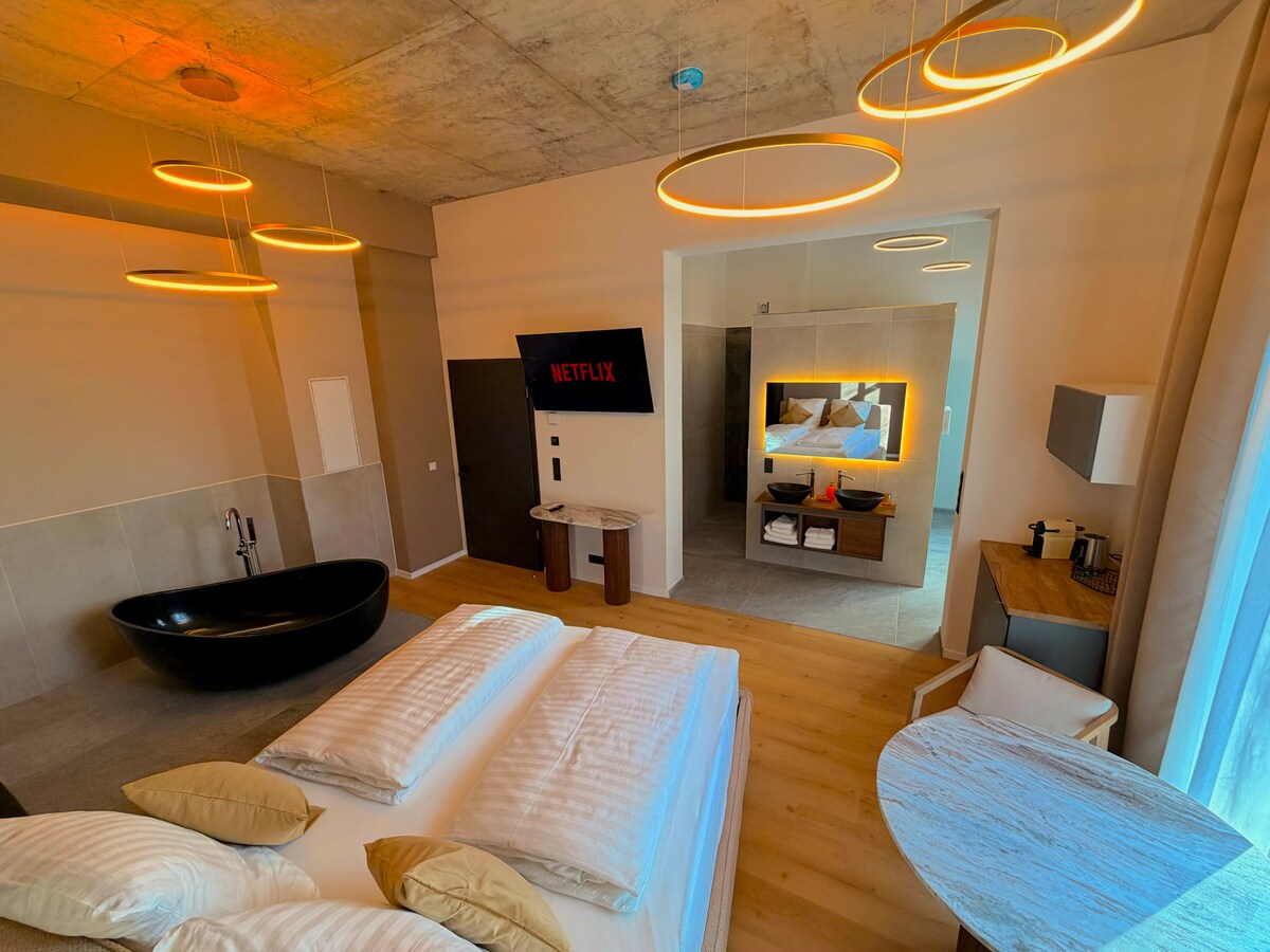 Bună, suntem Lena și Marcel și te invităm să te relaxezi cu întreaga familie în această cazare. Apartamentul nostru este liniștit și confortabil situat la periferie. Bucură-te de baia modernă, de dușul de intrare, precum și de bucătăria luminoasă, complet utilată. Livingul mare te invită să te relaxezi pe canapea cu Netflix și Xbox, aici poți intra în dormitor prin ușa gulerului, care dă lumină camerei! Pe terasă te poți relaxa confortabil lângă foc! Șemineul este numai decorativ!