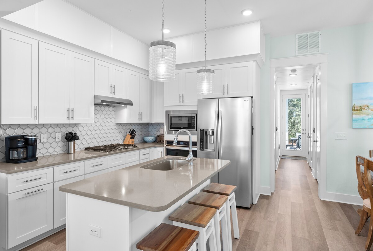 Bine ați venit la Casa By La Playa! O comoară de coastă situată chiar lângă 30A în Blue Mountain Beach, cu două accesări de plajă și dotări din belșug în apropiere. Această locuință cu 2 dormitoare și 2,5 băi găzduiește confortabil 8 oaspeți și are un garaj cu o singură mașină, aparate electrocasnice din inox și TV cu ecran plat în fiecare dormitor! O zonă deschisă de living și bucătărie modernizată întâmpină oaspeții la intrare, plus o ușă laterală de acces care duce la o curte premium împrejmuită cu gazon artificial, un set de mobilier, plus umbrelă pentru umbră!
