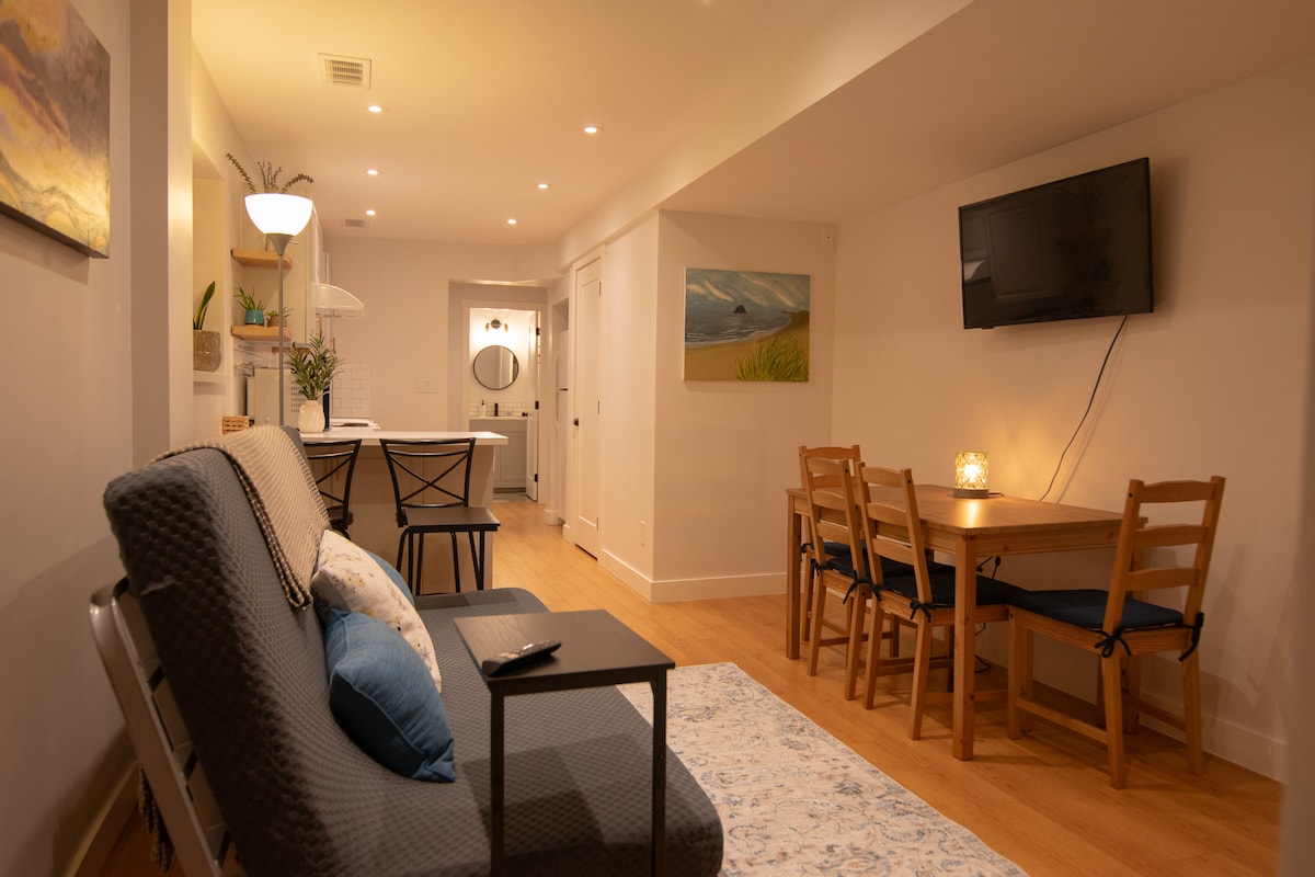 This cozy, modern above ground 1 bedroom & 1 bathroom basement suite is bright and spacious and offers everything you will need to make your stay as comfortable as possible. 70 inch TV w/ cable & Netflix, large sectional sofa with double pull out bed, Wifi, central air, in-suite laundry, quality linens with extra bedding. Lots of large windows which let in an abundance of natural light and a dedicated work space overlooking the backyard. Free parking. Private patio & smoking allowed outdoors.