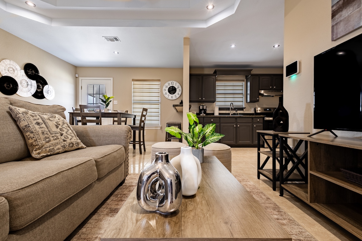 Această cazare elegantă este perfectă pentru călătorii de grup cu un spațiu spațios. Fă-ți călătoria de neuitat în șederea noastră modernizată! Mai puțin de 5 minute. De la graniță până în Mexic și atât de aproape de singurul cazinou din Texas! Restaurantele din oraș sunt la aproximativ 3 minute distanță. Avem WiFi gratuit și un spațiu de lucru pentru nevoile tale de afaceri. De asemenea, avem un spațiu de parcare gratuit. Indiferent dacă ești aici pentru afaceri sau pentru un timp memorabil, nu poți da greș stând în această casă departe de casă.