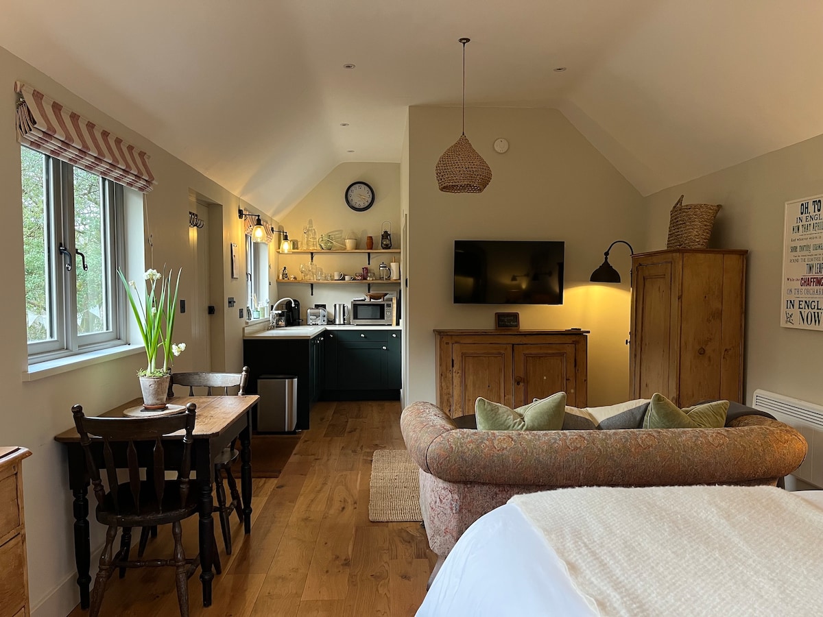 A light, airy studio offering calm, relaxing comfort with pubs, cafés and historic Midhurst all an easy walk away. Unwind in the secluded courtyard, enjoy cosy evenings in the spacious lounge, and sleep well in the super king bed. - Super King four-poster bed - Secluded courtyard with seating - High ceilings & light open plan layout - Walk to pubs, cafés & shops - Off-road parking - Sofa bed for flexible sleeping - South Downs walks, quaint villages & coastal trips - Close to Goodwood & Cowdray