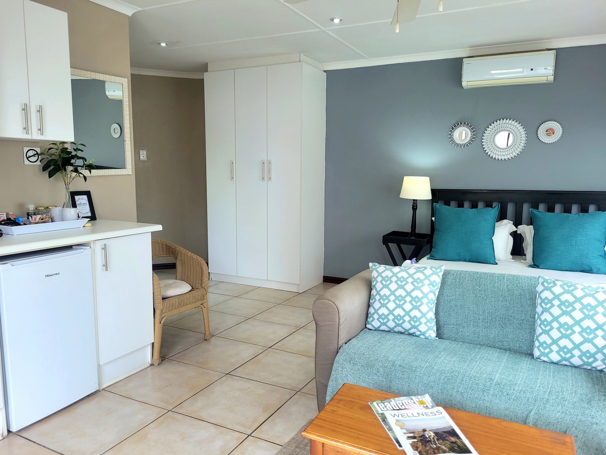 Camera 1 de la Riverbend Guest House este disponibilă pentru oaspeții Air BnB. Este un apartament studio de patru stele, cu un pat king-size sau două paturi single; o zonă de relaxare; un contor de bar și o chicinetă mică. Camera are o baie completă și duce pe puntea piscinei noastre, care are vedere minunată la mare și la râu.