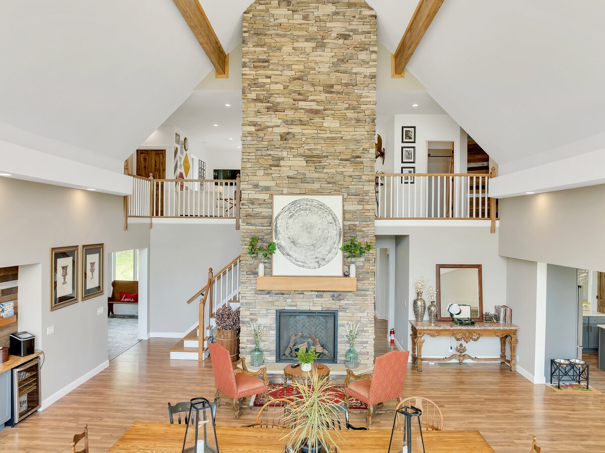Refugiu pe malul lacului, cu ferestre uriașe și vulturi americani! La doar 10 minute de June Farms și de alte locații populare pentru nunți. Bucură-te de priveliștile asupra lacului din camera mare și luminoasă sau relaxează-te lângă șemineu. Cameră confortabilă cu televizor, bucătărie spațioasă, 4 dormitoare (2 cu pat matrimonial king-size, 2 cu pat matrimonial queen-size, toate cu birouri) + 4 băi. Acces sezonier la lac, doc, terasă. Înoată/caiac pe riscul tău. Fără oaspeți pe ambarcațiune. Fără evenimente.