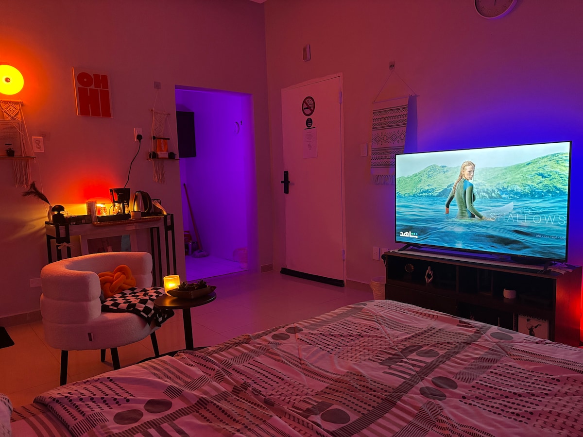 Descoperă o ședere distinctivă într-un apartament confortabil din orașul Al Khobar. Apartamentul are mai multe caracteristici: 1. Intrare inteligentă și securizată printr-o încuietoare inteligentă a ușii. 2. Un balcon frumos cu vedere. 3. Un colț de cafea echipat cu cafetieră, cuptor cu microunde și frigider mic. 4. Un ecran inteligent 4K. 5. Conexiune rapidă la internet 5G. 1. Podul Bahrain - în 5 minute. 2. Rashid Mall - 10 minute. 3. Faleza - 5 minute.