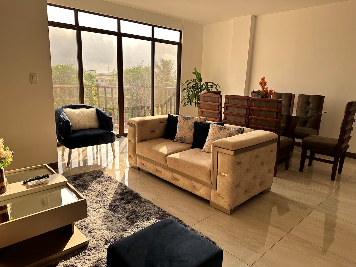 Apartament modern și confortabil, cu tot confortul și priveliști excelente. La câțiva metri de principala zonă comercială, gastronomică și de viață de noapte din oraș, unde veți găsi mâncăruri tipice ecuadoriene și internaționale, cafenele, baruri, cluburi, farmacii și piețe. Suntem la doar câteva minute de cele mai importante centre comerciale, universități, centre de afaceri, spitale și în drum spre autostrada care te va duce la diferitele plaje.