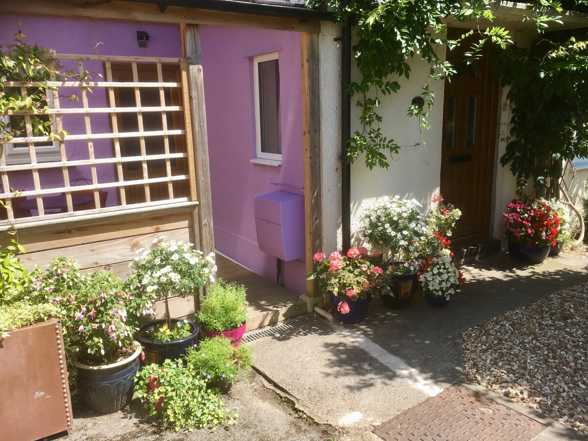 Bine ai venit la Glastonbury! Camera noastră privată de oaspeți este cu siguranță confortabilă și mică, dar este complet autonomă și frumos formată. Există un loc de parcare pe alee pentru tine, propria intrare, o terasă privată împodobită, duș privat și facilități, inclusiv: Wi-Fi, TV cu ecran plat, frigider și cuptor cu microunde. Camera este o anexă atașată în partea laterală a casei mele. Ceaiul, cafeaua, laptele și articolele ușoare pentru micul dejun vor fi în camera ta la sosire și există și un magazin mic și răcoros chiar după colț.