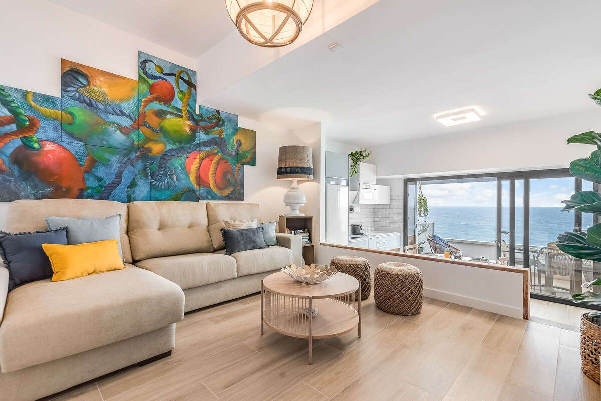 Un precioso apartamento de diseño, recientemente renovado con con impresionantes vistas de atardecer sobre el Océano desde su terraza. Primera línea al mar. Después de un largo día en la naturaleza, descansa en la cama King size (180x200cm) ----- A lovely apartment recently renovated with stunning views of the sunset, first line over the ocean from the terrace. Relax while reading, eating, or doing yoga. After a long day in nature, rest on the King size bed (180x200cm)