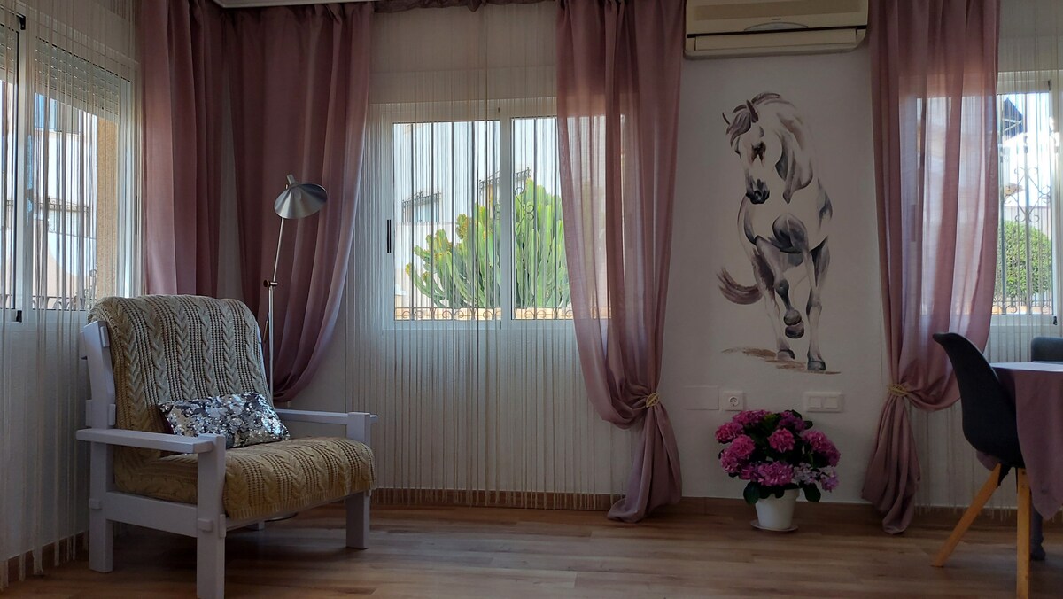 Acest bungalou privat cu check-in independent lângă terenul de golf Villamartin are 2 dormitoare și 1 baie, o bucătărie complet utilată și un solar uimitor pe acoperiș, cu o zonă de luat masa și grătar. Bungaloul este recent renovat, inclusiv aer condiționat nou-nouț, electrocasnice, paturi, saltele și mobilier. Există o piscină comunitară privată (1 minut de mers pe jos), terenuri de golf Villamartin (2 minute cu mașina) și unul dintre cele mai mari centre comerciale Zenia Boulevard pentru orice ai nevoie (5 minute cu mașina).