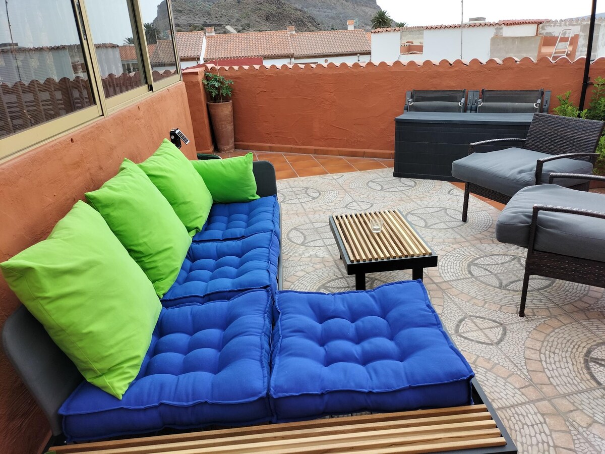 Situat în versantul sudic al insulei, în caldera vulcanică Tirajana, un loc idilic. Priveliștea se deschide la 360 ° spre plantațiile de palmieri din vale și spre vârfurile vulcanice. Are o piscină cu o cascadă, încălzită și tratată cu sare. Se află într-o proprietate lângă o altă casă de vacanță pentru două persoane. Ambele case sunt complet independente și au propriile lor accese și servicii, parcarea și piscina fiind singurele zone comune. Prin urmare, intimitatea este garantată.