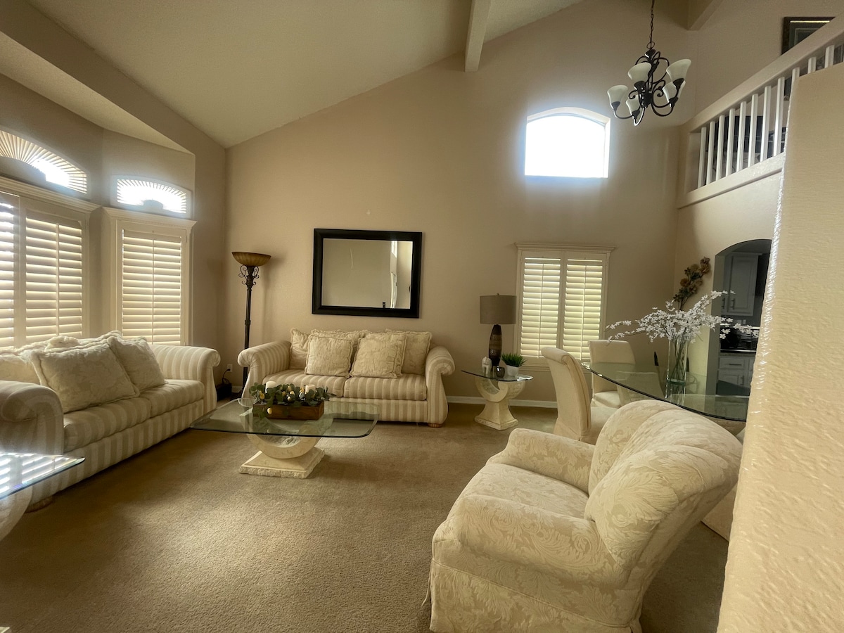Bine ai venit la Casa de Montwood, casa noastră spațioasă cu două etaje 5BR + casa de oaspeți din partea de est a Sun City. Pot dormi până la 14 persoane, cu toate facilitățile, inclusiv balcon, cadă cu hidromasaj, grătar, garaj și W/D. Situat convenabil în apropiere de Loop 375, magazine și restaurante, facilitând explorarea a tot ceea ce El Paso are de oferit. Ideal pentru familii, grupuri militare și prieteni. Cu check-in independent, poți ajunge în ritmul tău și poți începe șederea imediat. Rezervă acum!