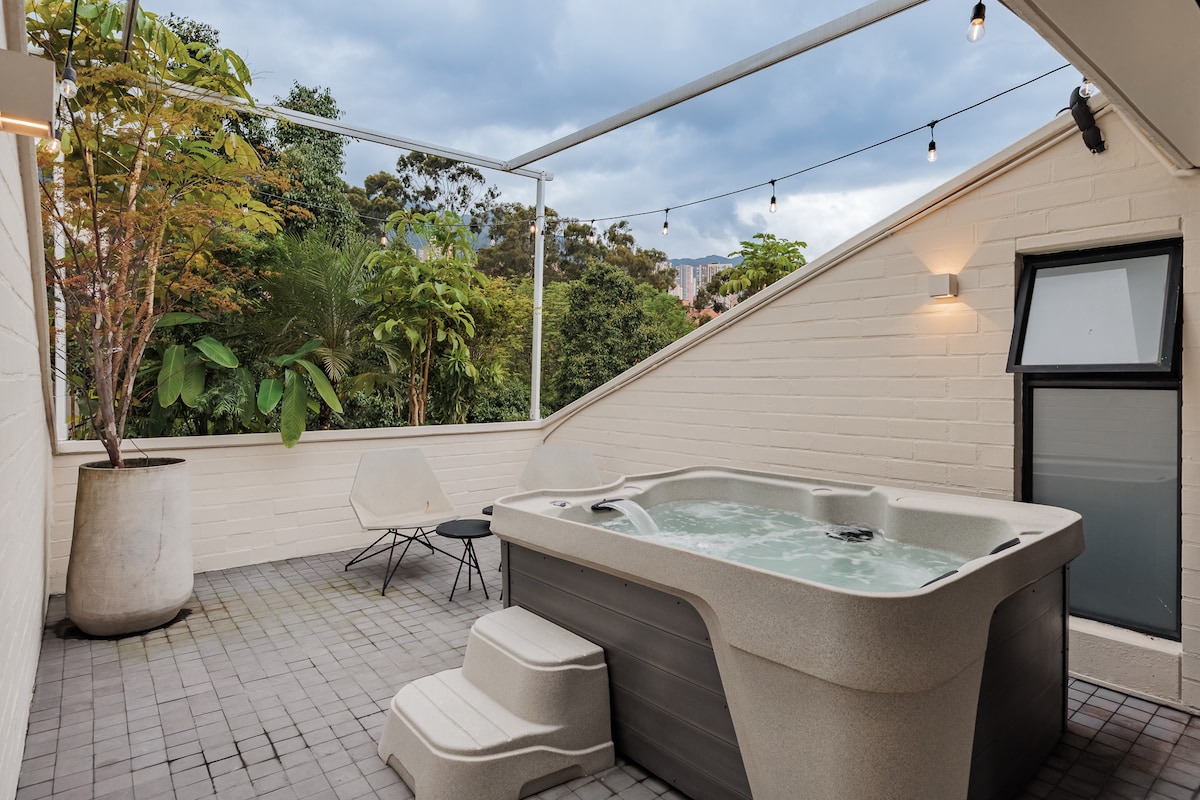Răsfață-te în Medellín din acest studio exclusivist cu un jacuzzi privat cu vedere panoramică, pat king-size, aer condiționat și vedere uluitoare la oraș — refugiul suprem pentru eleganță, confort și viață de noapte vibrantă. Situat în El Poblado, la câțiva pași de restaurantele, barurile de pe acoperiș, cafenelele și galeriile din Provenza, cu viața de noapte din Parque Lleras la câteva minute distanță. Bucură-te de un smart TV de 54" cu Netflix, spațiu de lucru cu Wi-Fi de mare viteză, bucătărie, mașină de spălat/uscător, sală de gimnastică, saună, piscină și baruri, restaurante și galerie la fața locului.