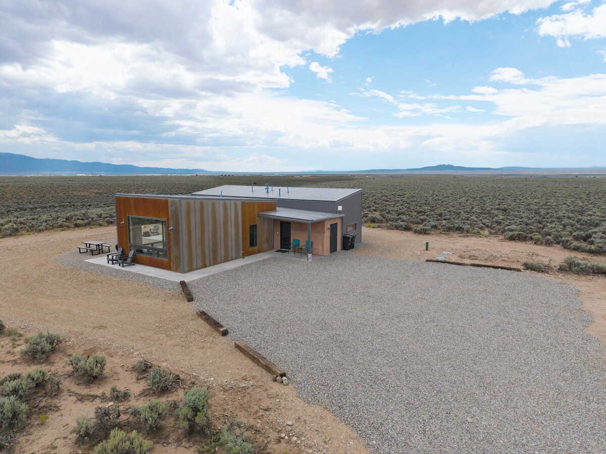Artistul Rod Goebel a creat acest sanctuar liniștit - o reședință, o capelă, o terasă ecranată și o casă de oaspeți, pe un teren rural uimitor de șase acri, complet împrejmuit. Bucură-te de o terasă acoperită, grătar, cadă cu hidromasaj și bucătărie parțială cu toate elementele esențiale. La doar 12 minute de oraș, lângă drumul Taos Ski Valley. Prietenos cu animalele de companie, sacru și privat, proprietatea noastră a fost numită top Airbnb în Taos pentru 2025 - „Doar în New Mexico” online. Relaxează-te cu artă, splendoarea naturii și relaxare adevărată, sub cerul înstelat.