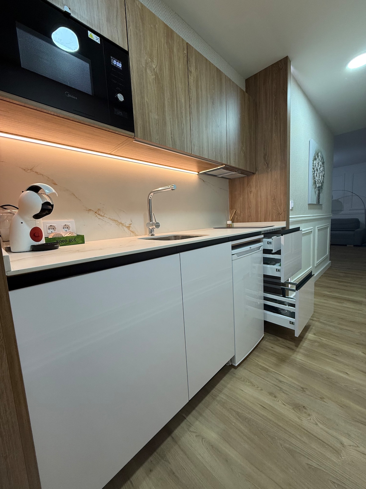 Situat într-o clădire recent renovată , acest apartament frumos, la etajul 4, inundat de lumină, este elegant și liniștit, cu design curat și contemporan. Intrarea are o galerie de ferestre suspendate care se deschide spre terasa interioară liniștită și tradițională. Bucătăria/camera de zi în plan deschis are un balcon pe o stradă pietonală (fără trafic), cu vedere la acoperișuri , clopotnițe din Cadiz și o vedere laterală la catedrală. Este nou-nouț, cu toate facilitățile moderne și locația perfectă.