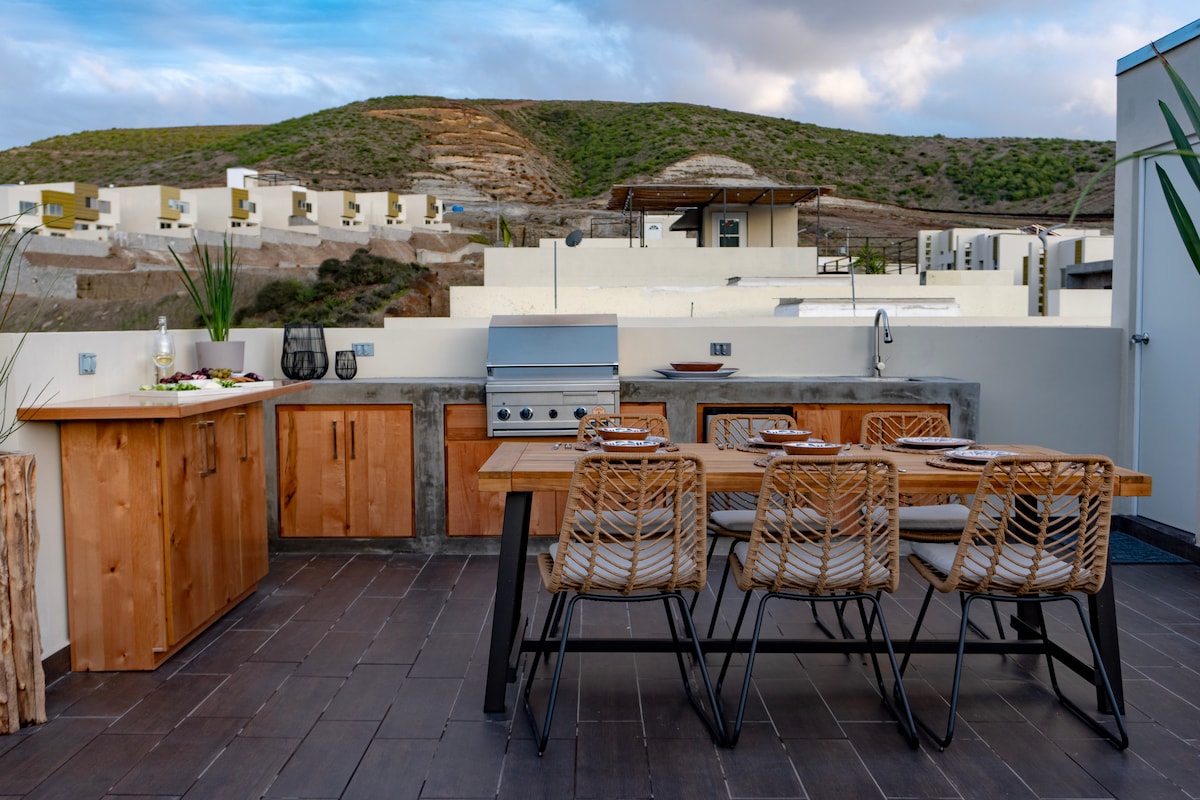Locuință privată situată în interiorul GAIA Residencial, cu 3 dormitoare, 2 băi complete, 2 toalete, terasă mică și terasă completă cu vedere frumoasă la munte și ocean! Locuința noastră este dedicată celor care caută un timp distractiv și relaxant cu prietenii și familia, situată convenabil la 3 minute de mers cu mașina de plajă, la 10 minute de mers cu mașina de Valle de Guadalupe și la 5 minute de mers cu mașina de centrul orașului Ensenada. Poți conta pe magazine alimentare, benzinării, berării, tacos și mese fine!