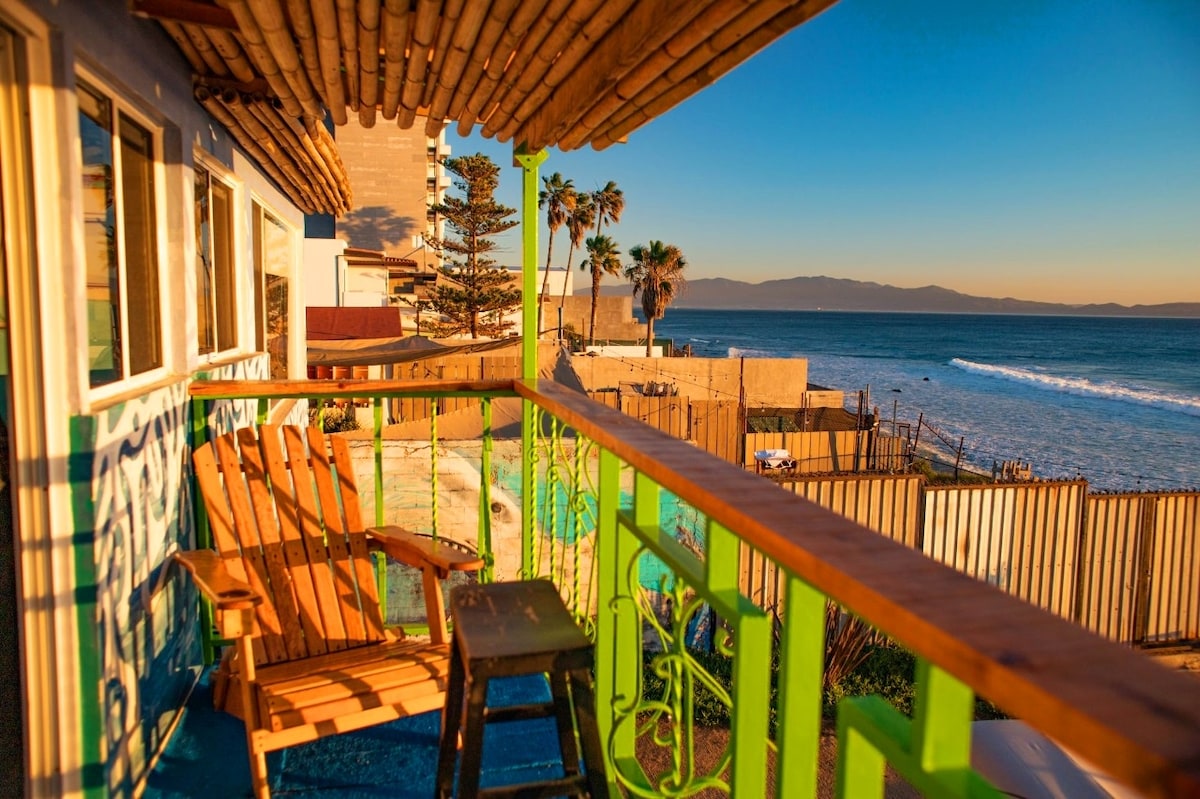 Unique 3-story oceanfront sanctuary in San Miguel, 15min from Valle de Guadalupe. Wake up to Pacific sounds and enjoy Ensenada’s best sunsets from our massive terrace with a firepit. WORK & PLAY: 15ft ocean-view desk for the ultimate workation. INDOOR CLIMBING: Try our unique climbing wall, a modern architectural gem. Just 300ft from the beach and surf break. PET FRIENDLY: Your furry friends are welcome! Experience comfort, surf, and wine in one place. Your ultimate Baja lifestyle starts here.