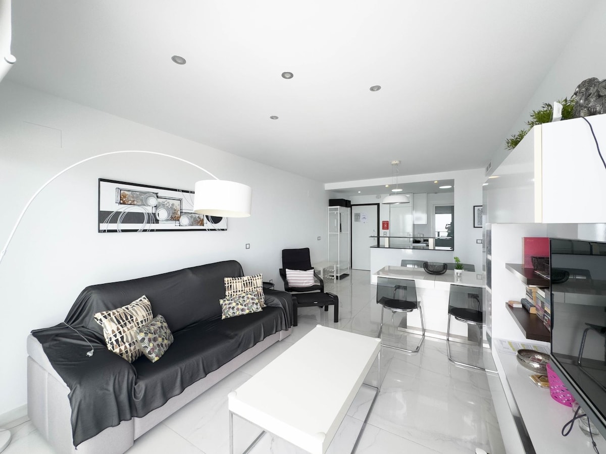 Pool is always open but not climatized. 123 m2 apartment with 30m2 Terrace, high quality household, first coastal line and really close to restaurants, bars and supermarkets Building and apartment accesible using wheelchair All rooms have sea view, desktop and ethernet Adjustable office chair for telework, perfect for coders No Car needed Electric blinds and awnings Very Good Quality Sound System and TV Children friendly You can find more luxe but none as close to water and comfortable