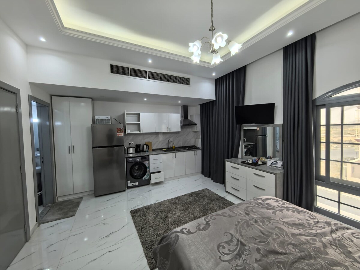 este un studio moders cu sediul în ajman alalia, lângă drumul principal, acces ușor este la aproximativ 35 de minute de aeroportul din Dubai, 25 de minute până la aeroportul Sharja, poziție bună au o bucătărie separată, o baie separată și un pat matrimonial mare, cu canapea și TV