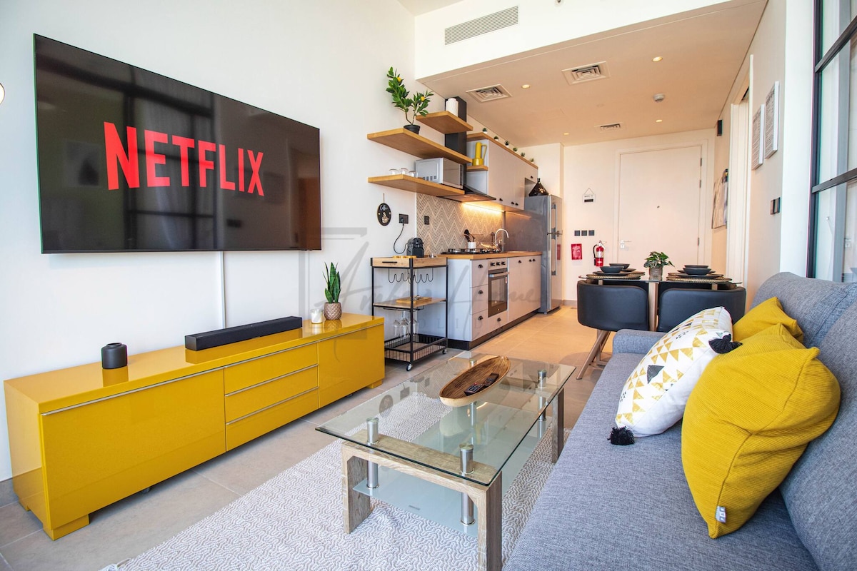 Welcome to our Luxury 1-bedroom apartment in Al Jada, the downtown of Sharjah. - 1BR with living room - Sofa that can accomdate 2 persons - Opposite Sabis school - Near Carrefour (For Grocery) - Al Jada offers a variety of coffee shops, cafes, grocery stores & play areas - TV With Netflix - Kitchen w/ all utensils. - Free Private Parking - Pool Access - Enjoy quick access to Sharjah Airport (10 mins) and Dubai Airport (20 mins) - Free Wifi