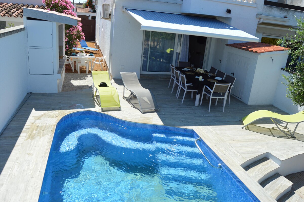 Beautiful house with pool in the center and near the beach<br>Air conditioning in all bedrooms, and in the living room, central heating.<br>Located in the best area of Empuriabrava on the Costa Brava, just 300 m from the center and 500 from the beach.<br>It has 6 bedrooms, and 4 bathrooms.<br>Ground Floor: consists of an air-conditioned room with flat screen (tnt, foreign channels) Wifi,<br>a dining room with kitchen equipped with refrigerator, microwave, oven, freezer, dishwasher, <br>