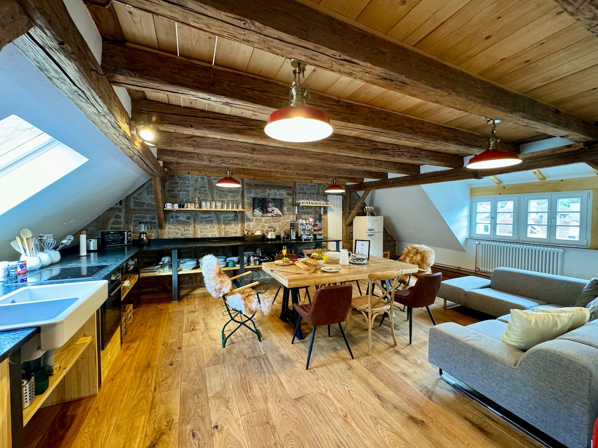 Îți mulțumim pentru interesul față de apartamentul meu. Aș fi încântat să vă urez bun venit la Casa noastră Pădurea Neagră renovat din 1894. Apartamentul de aproximativ 50 mp de la mansardă cu living, bucătărie deschisă, dormitor și baie este complet echipat cu parchet de stejar sau podea veche din scândură. Balconul are o priveliște frumoasă a casei de spa și a parcului spa. Trasee de mers pe jos, gastronomie, băi termale și magazine se află la câțiva pași.