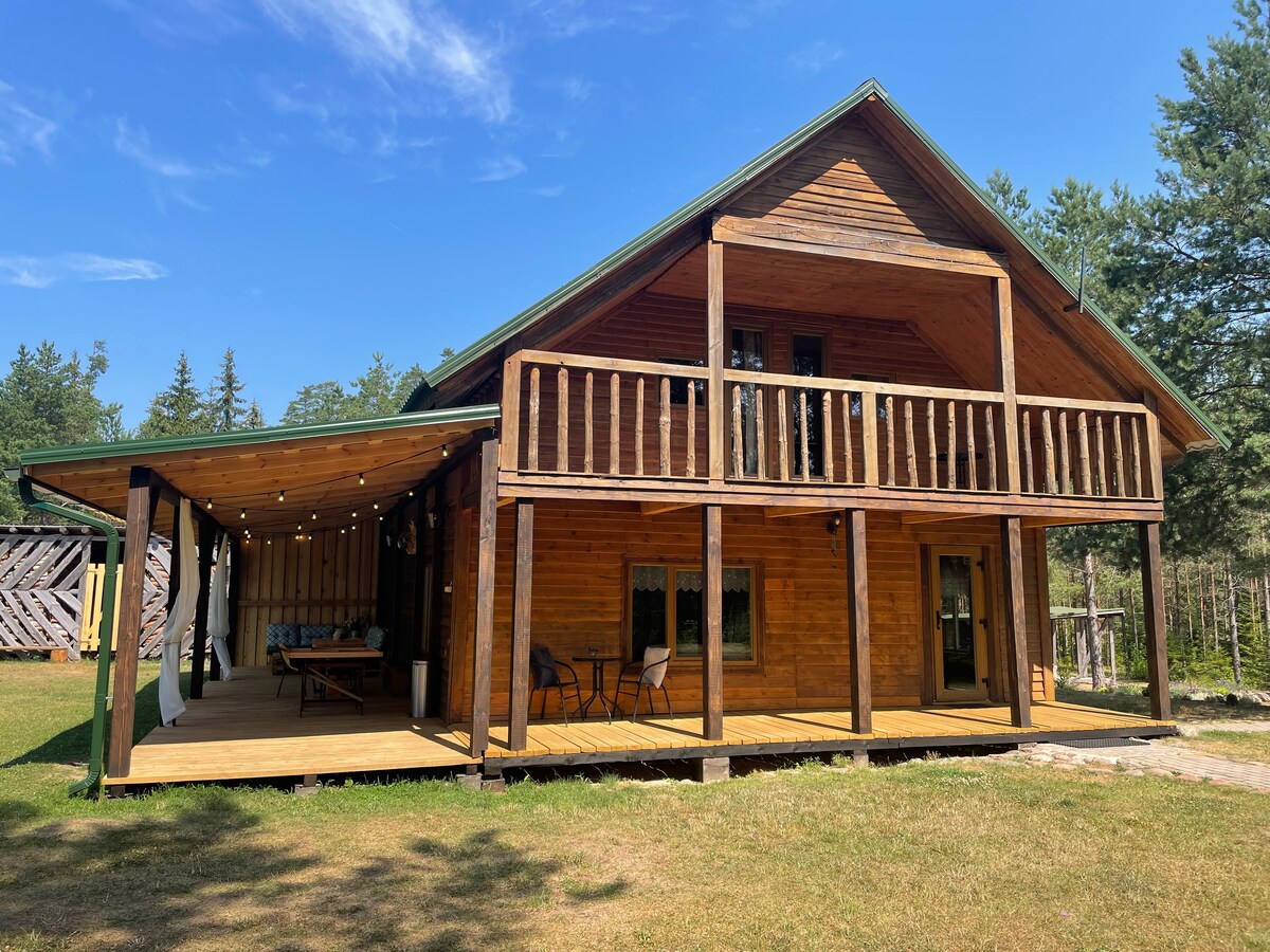 Casa de vacanță este situată lângă pădurea de pini, loc foarte frumos, liniștit și curat. Casa de oaspeți oferă saună mare și iaz frumos și iaz frumos lângă casă. Spațiu de locuit cald și confortabil la primul etaj. Trei dormitoare mari la etajul al doilea, cu paturi confortabile și o capacitate totală de 10 persoane. Șeminee interioare și exterioare. Casa de vacanță oferă activități sportive în aer liber, cum ar fi baschet, volei, fotbal. Leagăne, trambulină și cutie cu nisip pentru copii. Sauna contra cost.