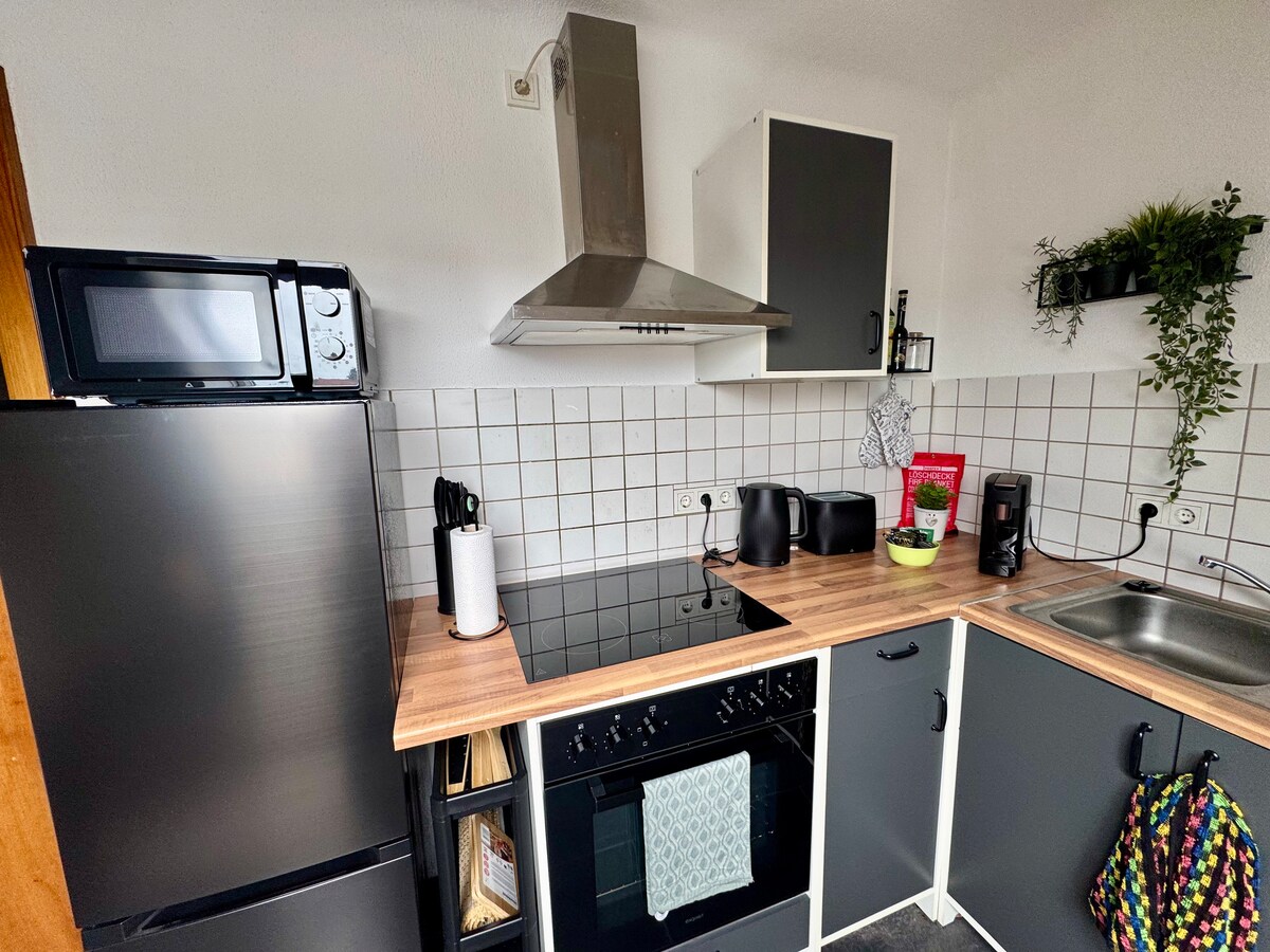 Gemütliche Wohnung mit Schlafzimmer (Doppelbett), Bad und Wohnzimmer mit Schlafsofa. Voll ausgestattete Küche inkl. Kaffeemaschine, Herd und Kühlschrank. WLAN, TV und Arbeitsplatz sind vorhanden. Kostenlose Parkplätze vor der Tür. Nur wenige Minuten bis zur Innenstadt, gute Anbindung an ÖPNV und Autobahn. Perfekt für Paare, Alleinreisende oder Geschäftsreisende, die Komfort und Ruhe schätzen. Einkaufsmöglichkeiten und Restaurants sind in der Nähe.