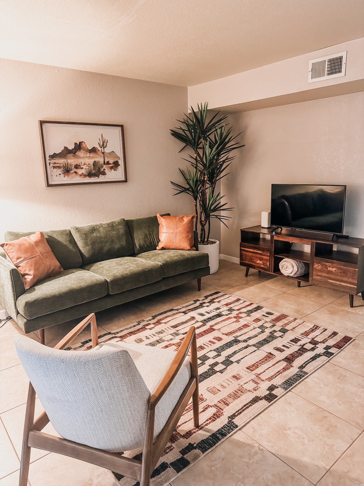 Acest spațiu elegant și atent oferă tot ce ai nevoie pentru un sejur relaxant, inclusiv o bucătărie modernă cu dulapuri bleumarin, un living confortabil cu scaune de pluș și decor elegant și dormitoare liniștite pline de lumină naturală. Baia spa, dotată cu gresie inspirată din marmură și detalii de lux, sporește confortul. Situat convenabil în apropiere de centrul orașului Phoenix, Saks Fifth Avenue, parcul de modă Biltmore, restaurante și la 10 minute de Phoenix Sky Harbor.