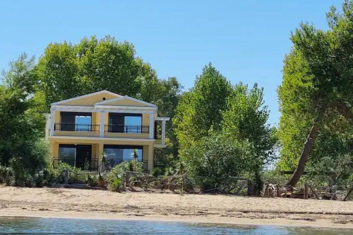 Vila Sunrise Beach - cu 4 dormitoare cu baie proprie, piscină de 10 m, „grădină de plajă” privată plus sală de gimnastică în grădină, pe plaja Bouka lângă Lefkimmi Vila noastră absolută de pe plajă. Doar plimbă-te pe aleea din grădină, prin poartă pe plaja liniștită cu nisip și în marea calmă, relaxează-te pe verandă și privește răsăritul soarelui, plimbă-te pe plajă pentru cocktailuri la barul de pe plaja Ammos sau pur și simplu relaxează-te lângă piscină. Situată în apropierea micului oraș Lefkimmi, vila are tot ce îți trebuie pentru o vacanță perfectă în familie!