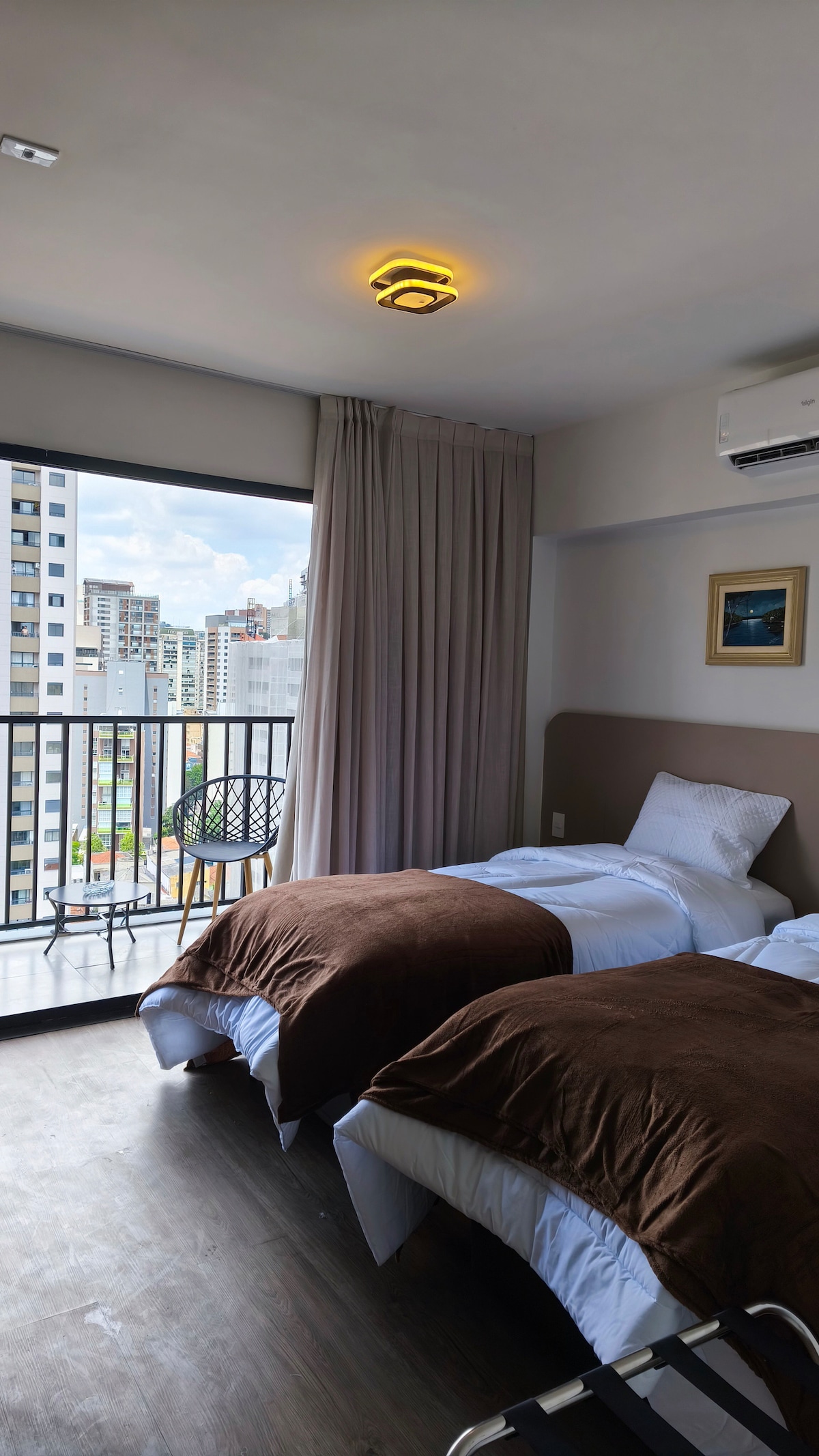 Apartament elegant de 50 m² situat la Bela Vista, are portar 24 de ore. 2 dormitoare (doar 1 cu aer condiționat și pat dublu, al doilea este destul de mic și poate fi folosit ca birou, potrivit pentru o canapea extensibilă dublă) și 1 baie. Cu priveliști uimitoare de la fiecare fereastră, este un loc minunat pentru a lucra și a te relaxa. Jet-tube-ul privat de pe balcon este un loc fantastic pentru a te bucura de priveliștea orașului. Ideal pentru cupluri, profesioniști sau familii mici care caută confort, comoditate și una dintre cele mai bune priveliști din oraș.