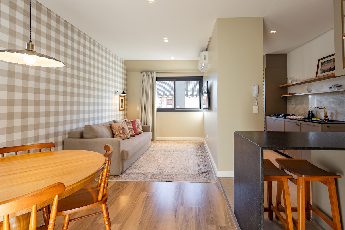 Stai confortabil și sofisticat în inima orașului Gramado. Acest apartament frumos, nou și mobilat cu finețe, cu 1 dormitor, a fost proiectat pentru a oferi o experiență confortabilă și de neuitat în Serra Gaúcha. Perfect pentru cupluri sau familii mici care doresc să fie în centru, la 500 de metri de Rua Coberta. Acest apartament găzduiește confortabil 1 cuplu + 1 copil. De asemenea, are o canapea extensibilă care poate găzdui încă 2 persoane.