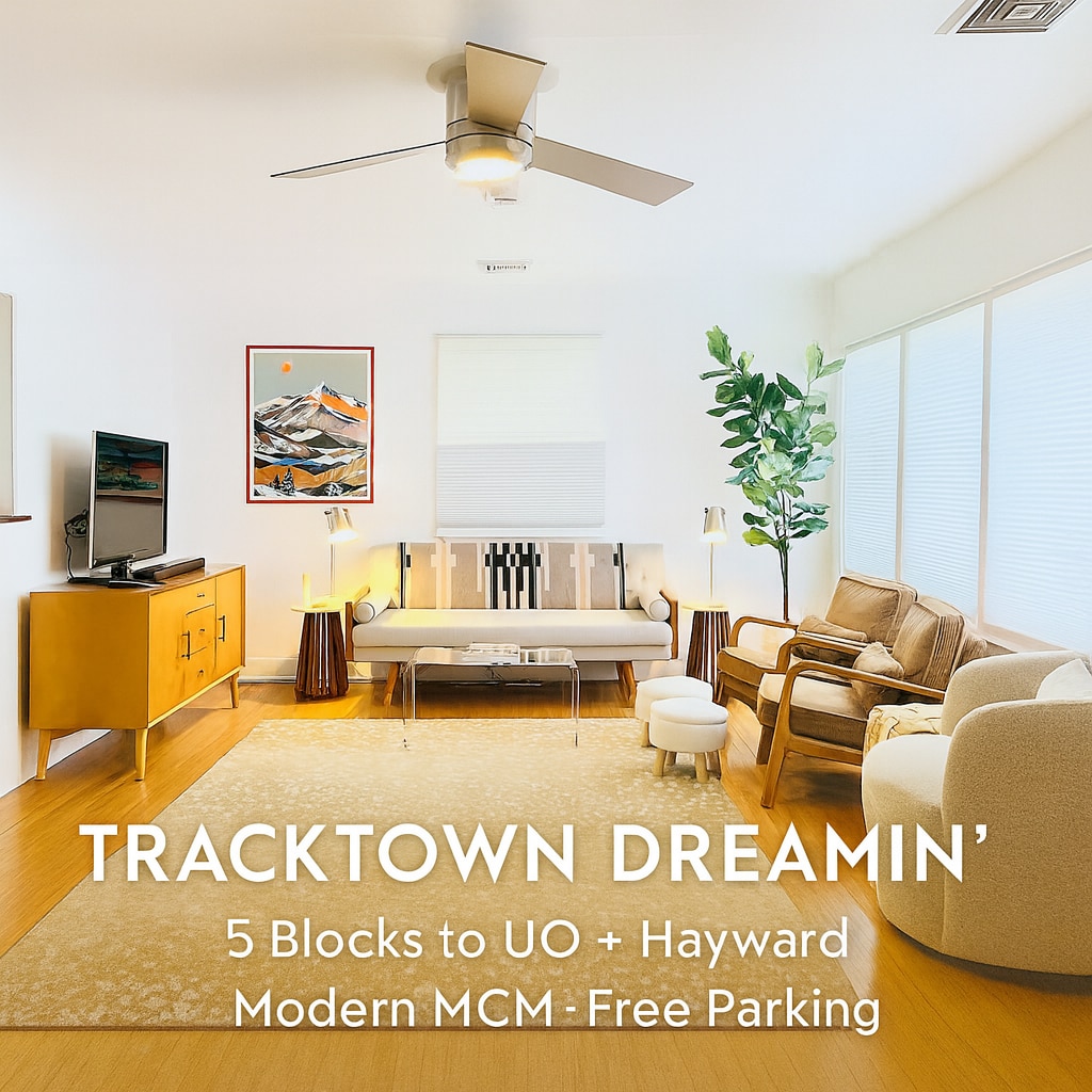 Bine ai venit la TrackTown Dreamin' - un apartament modern MCM cu 2 dormitoare, la doar 5 străzi de Universitatea din Oregon și la 4 străzi de Hayward Field. Bucură-te de dormitoare cu pat king-size + queen-size, internet prin fibră optică, o bucătărie completă, o stație de discuri de vinil și o curte confortabilă cu lumini de cafenea. La câțiva pași de parcuri, restaurante și trasee, la 20 de minute de mers pe jos de Matthew Knight Arena și acces ușor la campus și în centrul orașului Eugene. Plănuiești o călătorie viitoare? Atinge inima pentru a adăuga această locuință la lista de dorințe, astfel încât să fie ușor de găsit mai târziu.