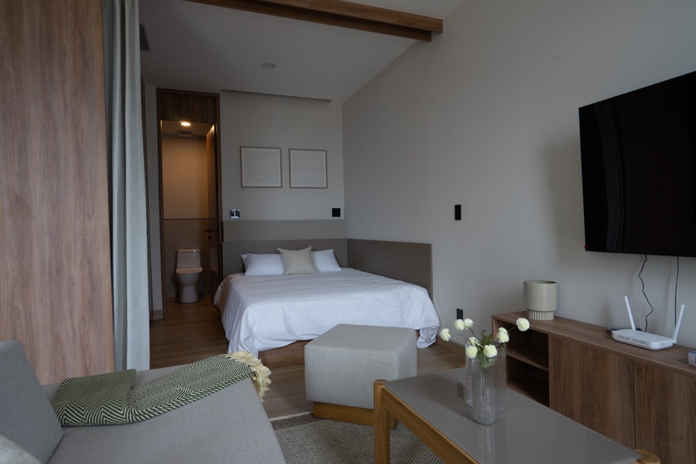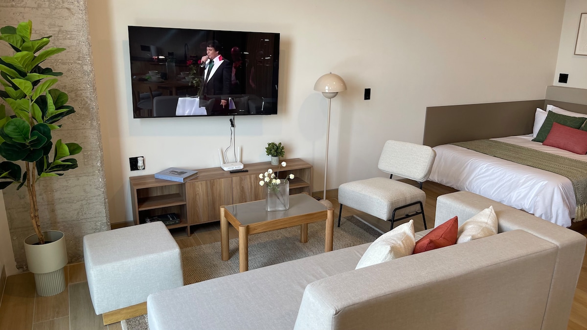 MORADA LIVING Perfect pentru prieteni, colegi sau călători care preferă să doarmă separat, acest studio oferă două paturi de o persoană, o canapea extensibilă, o bucătărie completă, un televizor inteligent și un birou. Designul său modern îl face practic și confortabil pentru șederi scurte sau lungi. Clădirea are zone comune plăcute și se află într-o locație strategică: în apropiere de Centrul Istoric, Colonia Americana și Parque Agua Azul. Confort, flexibilitate și locație într-un singur loc.