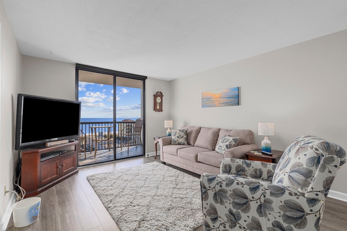 🌊 2025 Comoară recent renovată pe malul oceanului! Bucură-te de priveliști uimitoare ale oceanului din podea până în tavan de la două balcoane directe pe malul oceanului, în acest apartament modern, cu podele elegante din lemn, decor de designer și un perete elegant de accent din lemn. Situat în inima Myrtle Beach, la câțiva pași de Boardwalk, Family Kingdom Amusement Park, 2nd Ave Pier și restaurante de top. Plimbă-te peste tot și relaxează-te confortabil în refugiul tău luxos și modern de pe malul oceanului!