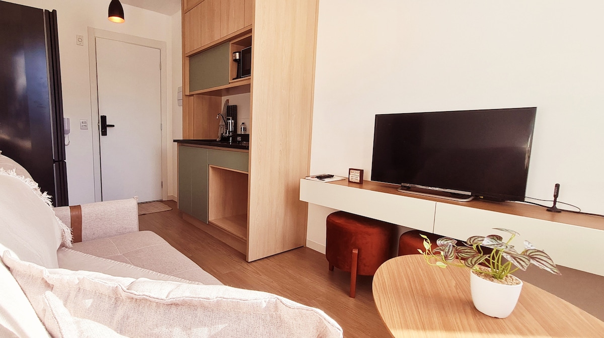 Studio modern și funcțional în fața Eldorado Shopping – ideal pentru muncă sau petrecere a timpului liber. Fie că este vorba de o călătorie de afaceri sau de un tur al obiectivelor turistice, acest studio a fost conceput pentru a oferi confort, caracter practic și locație strategică. Situat în fața centrului comercial Eldorado, la câteva străzi de stația de metrou/CPTM și o stație de autobuz chiar în față, vei avea acces ușor la tot São Paulo – de la spitale și universități la centre de afaceri și atracții turistice.