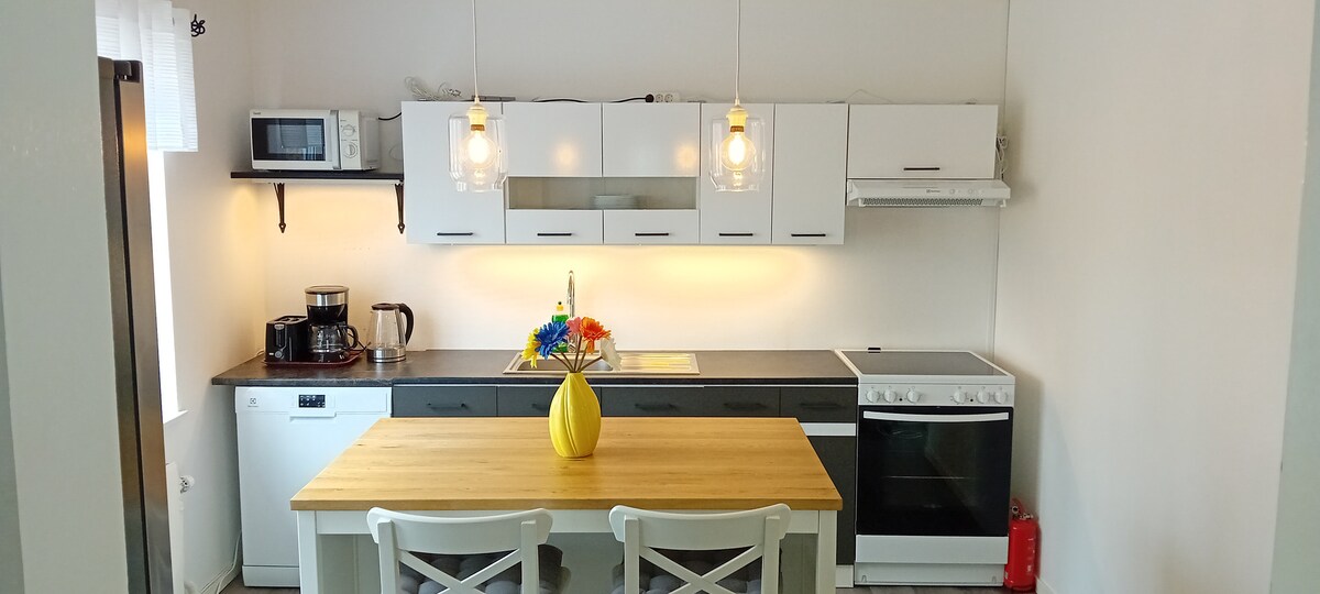 Locație rurală frumoasă, chiar lângă Röstånga. Funcțional și proaspăt. Aveți două etaje de aproximativ 25 mp construite în frontonul unui hambar, doar pentru dvs. Dormitorul este la etaj, dar scara nu are balustradă. Bucătăria are două plite, hotă, cuptor cu microunde, cafetieră, fierbător de apă și frigider cu congelator. Fără cuptor. Complet utilată cu ustensile de bucătărie. Canapeaua extensibilă se află la parter și, din păcate, nu este atât de confortabilă pentru dormit. ATENȚIE: prosoapele, lenjeria de pat și curățenia sunt incluse!