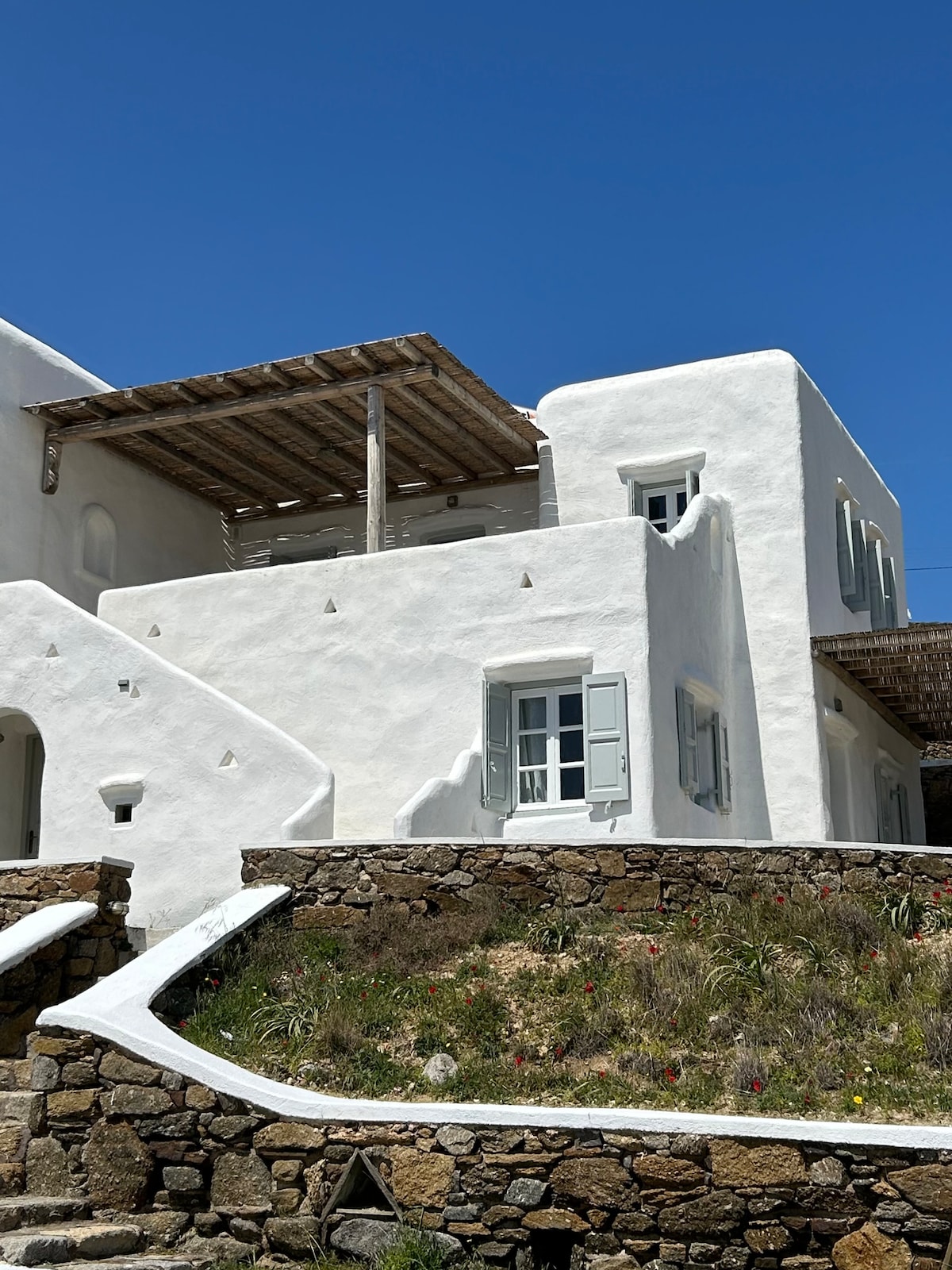 Casa seducătoare, nou-nouță, este un rai luxos pentru odihnă liniștită. Casa cu arhitectură Myconiană constă din 2 dormitoare cu paturi duble king size (separabile în paturi de o persoană), 2,5 băi, living cu 1 canapea, TV prin satelit, internet Wi-Fi gratuit - sufragerie, bucătărie complet utilată, terasă cu masă din lemn, jacuzzi în aer liber, grădină și zonă de parcare privată.
